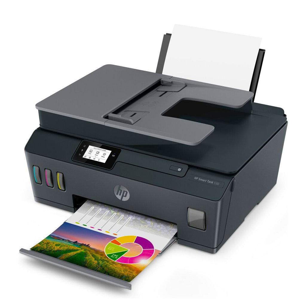 | Contenido de la caja | 4SB24A Impresora Todo-en-Uno HP Smart Tank 530 inalámbrica; Dos botellas de tinta originales HP GT53XL, de 135 ml, negro; Botella de tinta original HP GT52, cian; Botella de tinta original HP GT52, magenta; Botella de tinta original HP GT52, amarillo; Volante de advertencia sobre las tintas; Guía de instalación; Guía de referencia; Volante regulatorio; Tarjeta de garantía, cable de alimentación |